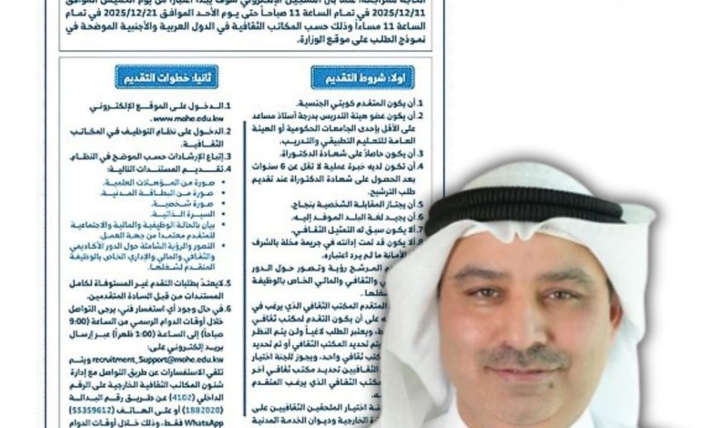 واختتم د. البصيري تصريحاته بالتأكيد على أهمية الاطلاع على جميع الشروط والضوابط الواردة في الإعلان قبل تقديم طلب الترشيح، داعيًا المتقدمين ممن تنطبق عليهم الشروط إلى الالتزام بالمهلة المحددة واستكمال البيانات المطلوبة بدقة. وأعرب عن ثقته في قدرة الكفاءات الوطنية على تمثيل الكويت خير تمثيل في الخارج، مؤكداً حرص الوزارة على اختيار العناصر المؤهلة أكاديمياً ومهنياً بما يعكس الصورة المشرّفة لدولة الكويت في الساحة الثقافية والأكاديمية الدولية.