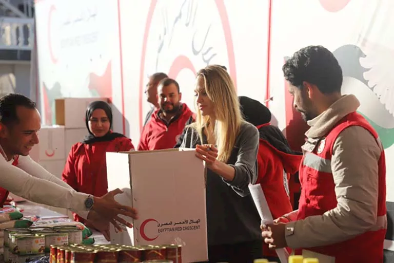 وكان الهلال الأحمر المصري، في ذات السياق، قد رافق النجمة العالمية أيضًا في زيارة إلى معبر رفح لتفقد الشاحنات المصطفة والتحدث إلى المتطوعين والسائقين.
