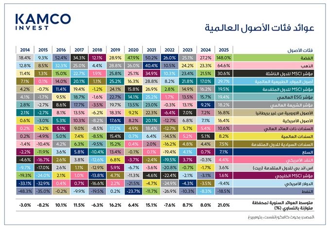 أفاد تقرير صادر عن «كامكو إنفست» بأن محافظ فئات الأصول العالمية واصلت تحقيق المكاسب للعام الثالث على التوالي خلال 2025، مدعومة بالأداء القوي لمعظم فئات الأصول، بما في ذلك الأسهم والسندات والعقارات والسلع الأساسية.