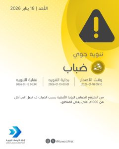 أصدرت إدارة الأرصاد الجوية الكويتية، اليوم الأحد، تنويهاً جوياً بشأن تشكّل الضباب، محذّرة من انخفاض مستوى الرؤية الأفقية خلال ساعات الليل وفجر الاثنين في بعض مناطق البلاد.