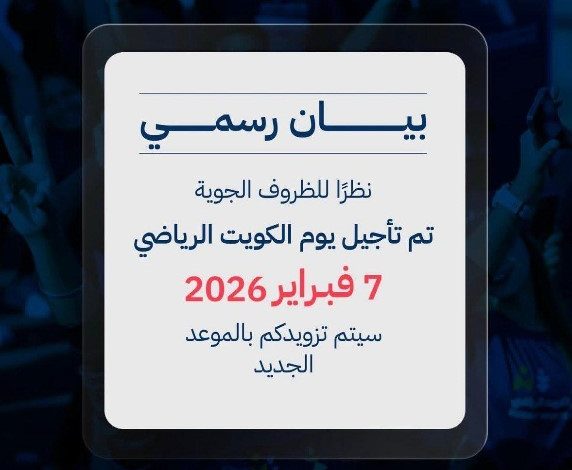 أعلنت الهيئة العامة للرياضة عن تأجيل يوم الكويت الرياضي في نسخته الثالثة، والذي كان من المقرر انطلاقه في تمام الساعة الثامنة من صباح اليوم السبت على جسر الشيخ جابر الأحمد، وذلك بسبب الأحوال الجوية السائدة، مؤكدة أنه سيتم تحديد موعد جديد للفعالية والإعلان عنه في وقت لاحق.