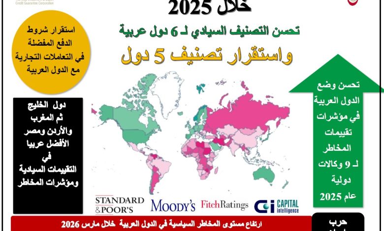 يأتي هذا التطور بعدما شهدت الدول العربية خلال العام 2025 تحسنا نسبيا في التصنيفات السيادية وتقييمات المخاطر السياسية والتجارية، وذلك رغم هيمنة التوترات الجيوسياسية جراء استمرار العدوان الإسرائيلي والتوترات في فلسطين المحتلة ولبنان وسوريا والعراق واليمن والسودان والصومال.