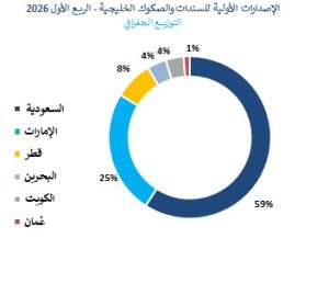 وبلغت قيمة الإصدارات الكويتية 1.98 مليار دولارمن خلال 3 إصدارات في الربع الأول 2026 ويمثل ارتفاع بنسبة 40.7% من الفترة ذاتها من العام الماضي ،و,تصدّرت المملكة العربية السعودية من حيث إجمالي قيمة الإصدارات الأولية للسندات والصكوك الخليجية خلال الربع الأول 2026 بقيمة إجمالية بلغت 32.54 مليار دولارمن خلال 42 إصدار، بإرتفاع نسبته 3.1% من الفترة ذاتها من العام الماضي (31.56 مليار دولار)، وهو ما يمثل 59.1% من إجمالي إصدارات هذا الربع. وتليها الامارات العربية المتحدة ب13.257 مليار دولارمن خلال 36 إصدار، بارتفاع نسبته 33.1% من الفترة ذاتها من العام الماضي، وهو ما يمثل 24.7% من الإجمالي. كما بلغت حصة الإصدارات القطرية 4.20 مليار دولارمن خلال 11 إصدار، أي ما يمثل 7.6% من إجمالي الإصدارات. وبلغت قيمة الإصدارات البحرينية 2.10 مليار دولارمن خلال إصدارين بارتفاع نسبته 37.2% من الفترة ذاتها من العام الماضي. ، في حين بلغت الإصدارات العمانية 650 مليون دولارمن خلال إصدارا واحدا، ممثل 1.2% من حصة السوق.
