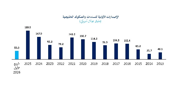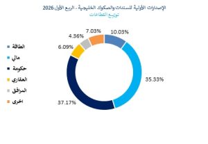 تصدرت الإصدارات الحكومية من حيث إجمالي القيمة للإصدارات الأولية الخليجية من السندات والصكوك خلال الربع الأول 2026، بقيمة إجمالية بلغت 20.46 مليار دولارمن خلال 12 إصدار، أو 37.2% من إجمالي قيمة الإصدارات، في حين حلت إصدارات القطاع المالي في المرتبة الثانية بقيمة إجمالية بلغت 19.45 مليار دولارمن خلال 64 إصدار، ممثلا 35.3% من إجمالي الإصدارات لهذا الربع. ويشكل ذلك ارتفاع في الإصدارات من الفترة ذاتها من العام الماضي للإصدارات الحكومية (5.5%) وانخفاض لإصدارات القطاع المالي (14.0-%). وتليها إصدارات قطاع الطاقة بقيمة إجمالية بلغت 5.52 مليار دولارمن خلال 6 إصدارات، ممثلة 10.0% من إجمالي قيمة الإصدارات، فيما تشكل القطاعات الأخرى نسبة 17.5% من إجمالي قيمة الإصدارات.