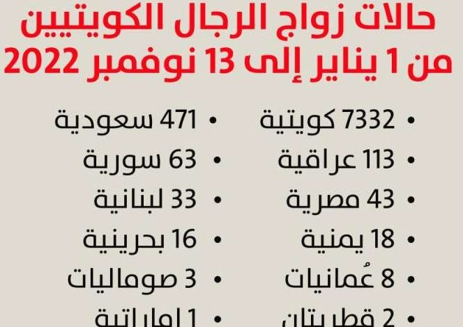 وبلغ عدد زيجات الرجال الكويتيين من سعوديات 471 وفقاً لإحصائية عن الفترة من أول يناير إلى 13 نوفمبر الماضي، فيما بلغ عدد حالات الزواج للكويتيين من عراقيات 113، و63 من سوريات، و43 من مصريات، و33 لبنانية، و18 يمنية، و16 بحرينية، و8 عُمانيات، و3 صوماليات، و2 من قطر، وحالة زواج واحدة من إماراتية.