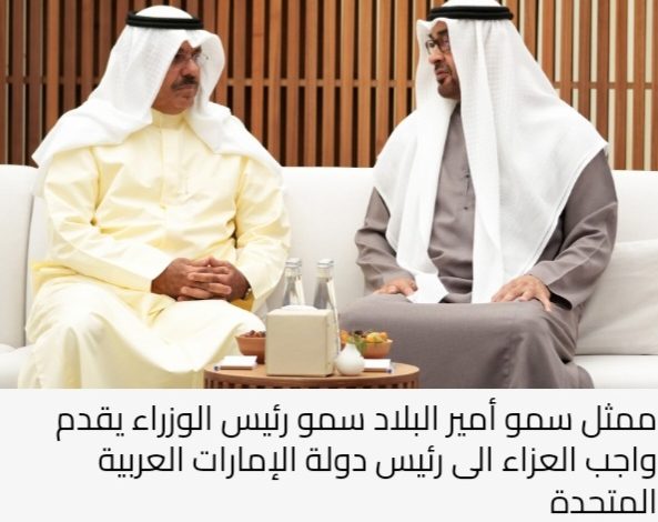 متابعة – غلوبل – قام ممثل سمو أمير البلاد الشيخ نواف الأحمد سمو الشيخ أحمد نواف الأحمد الصباح رئيس مجلس الوزراء والوفد المرافق له اليوم بتقديم واجب العزاء إلى رئيس دولة الإمارات العربية المتحدة الشيخ محمد بن زايد وإلى شيوخ عائلة آل نهيان الكرام في وفاة المغفور له بإذن الله تعالى الشيخ سعيد بن زايد آل نهيان.