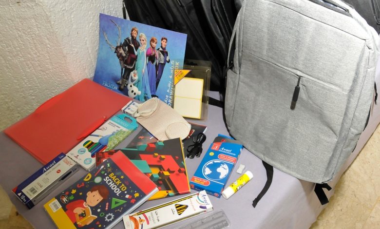 وأوضح أن الحقيبة المدرسية تحتوي على كل أنواع القرطاسية المدرسية من أقلام وكراسات وحافظة أقلام وتشكيلة منوعة من أقلام الخط والرسم وغيرها وهي تفي باحتياجات كل المراحل العمرية لأطفال الأسر المحتاجة والمتعففة.