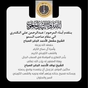 الكويت غلوبل – يتقدم أبناء المرحوم عبدالرحمن على الكندري إلى مقام صاحب السمو الشيخ مشعل الاحمد الجابر الصباح حفظه الله ورعاه وأسرة آل الصباح الكرام والشعب الكويتي الكريم بأحر التعازي والمواساة فى المصاب الجلل بوفاة المغفور له بإذن الله تعالى الشيخ نواف الاحمد الجابر الصباح.