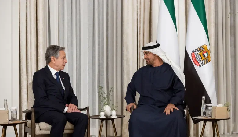 بحث رئيس دولة الإمارات الشيخ محمد بن زايد آل نهيان ، مع وزير الخارجية الأمريكى أنتونى بلينكن، خلال زيارته الحالية للامارات – عددا من القضايا الإقليمية والدولية محل الاهتمام المشترك والتطورات فى منطقة الشرق الأوسط خاصة المستجدات فى الأراضى الفلسطينية المحتلة والتداعيات الخطيرة للأزمة فى قطاع غزة على السلام والاستقرار والأمن فى المنطقة جميعها.