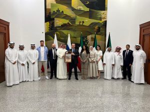 كما حرص محمد الكندري رئيس نقابه العاملين للتعليم التطبيقي والتدريب وأمين صندوق اتحاد النقابات والامين العام للوفد في مهرجان روسيا سوتجي على تقديم درع تذكارى للسفير،الروسى مع بعض الهدايا التذكارية الأخرى التى نالت إعجاب السفير.