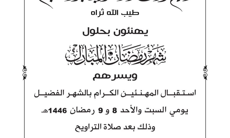 استقبال المهنئين الكرام بالشهر الفضيل يومي السبت والأحد 8 و 9 رمضان 1446