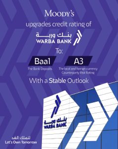 وتمثل هذه الترقية الشاملة اعترافاً دولياً بالتقدم الاستراتيجي الذي حققه بنك وربة في الفترة الأخيرة، الأمر الذي يضعه اليوم في مصاف البنوك الرائدة إقليمياً وعالمياً، إذ شملت الترقيات ترقية تصنيف الودائع من Baa2 إلى Baa1، ترقية التقييم الائتماني الأساسي (BCA) من ba3 إلى ba2، وترقية التقييم الائتماني الأساسي المعدل إلى ba2 وكذلك رفع تصنيف مخاطر الطرف المقابل للعملة المحلية والأجنبية من Baa1 إلى A3ـ فيما غيرت “موديز” النظرة المستقبلية إلى مستقرة.