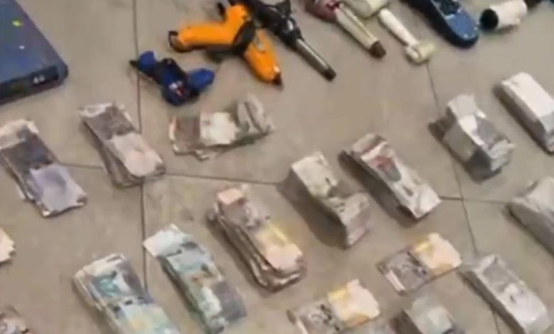 وبتفتيش الشاليه، عُثر على أكثر من (20) جهاز طباعة مزودة بماسحات ضوئية، وعشرات الأحبار والأصباغ ومقصات الأوراق، وآلاف الأوراق النقدية المزيفة الجاهزة للاستعمال، ومئات الأوراق قيد التجهيز، بالإضافة إلى لواصق ومعدات خاصة بالتزوير ومواد كيميائية وأدوات تعاطي.